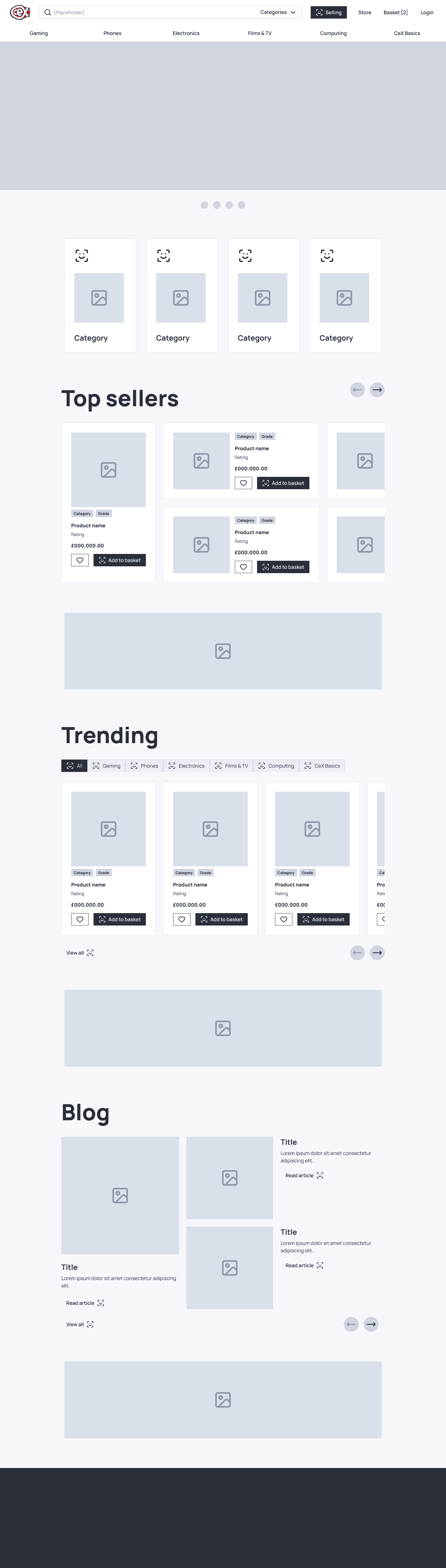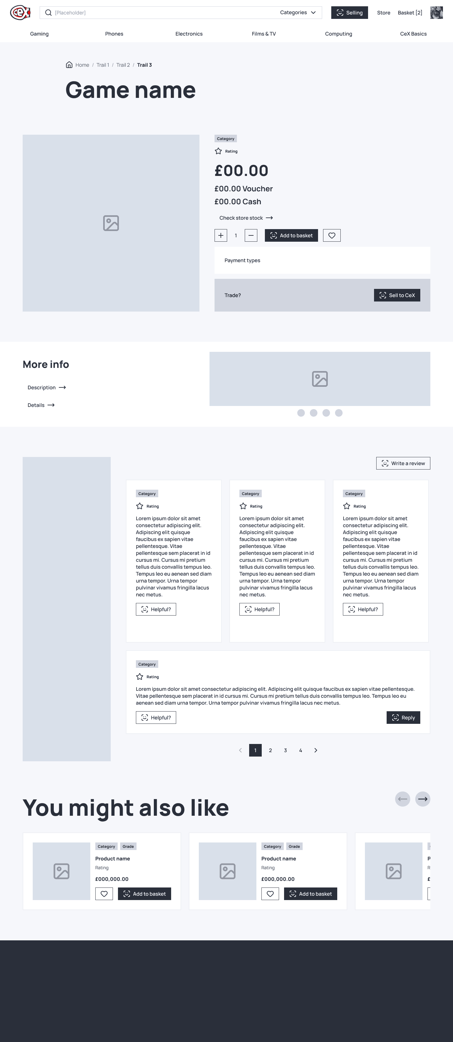 Early wireframes covered the core CeX experience, from discovery through to checkout and selling. I restructured the homepage, browse and product pages, franchise sections, store finder, basket, and sell flow to establish clearer hierarchy and more consistent layout patterns.