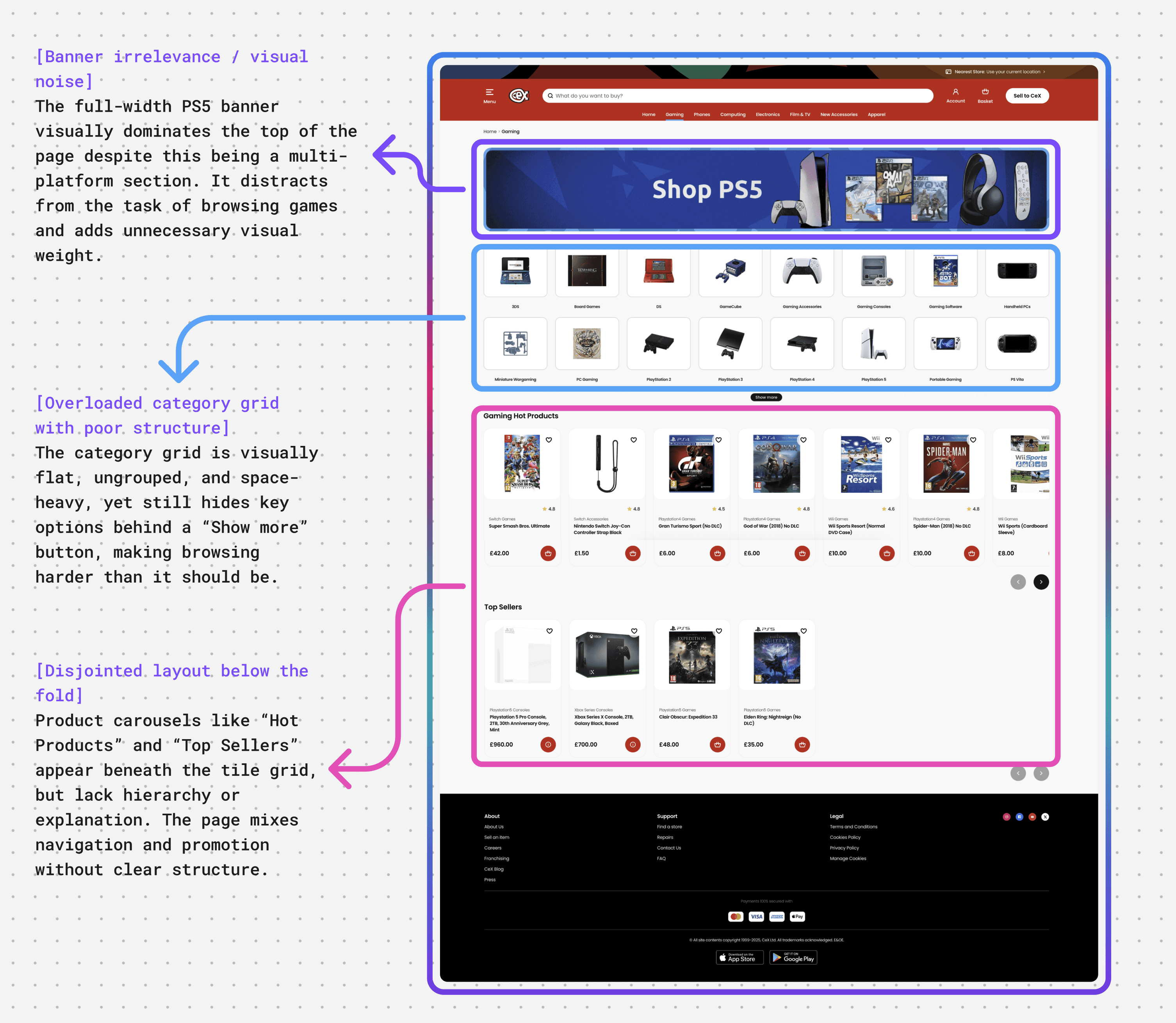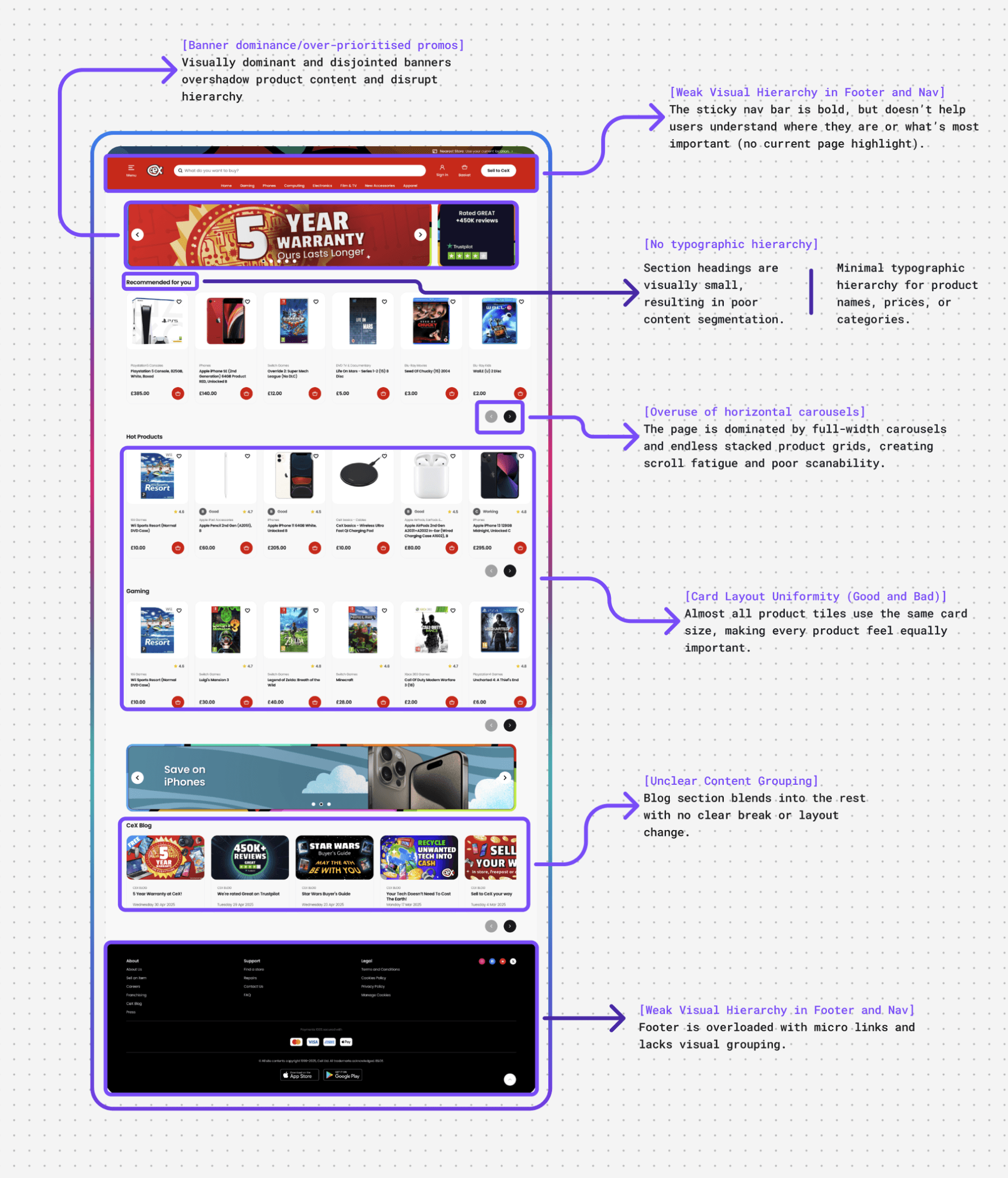 This quick visual audit helped me prioritise which layout and content decisions to challenge in the redesign, especially around spacing, typography, and visual hierarchy. Rather than overhaul every screen, I focused on creating a more focused, scannable experience while maintaining CeX’s recognisable identity.