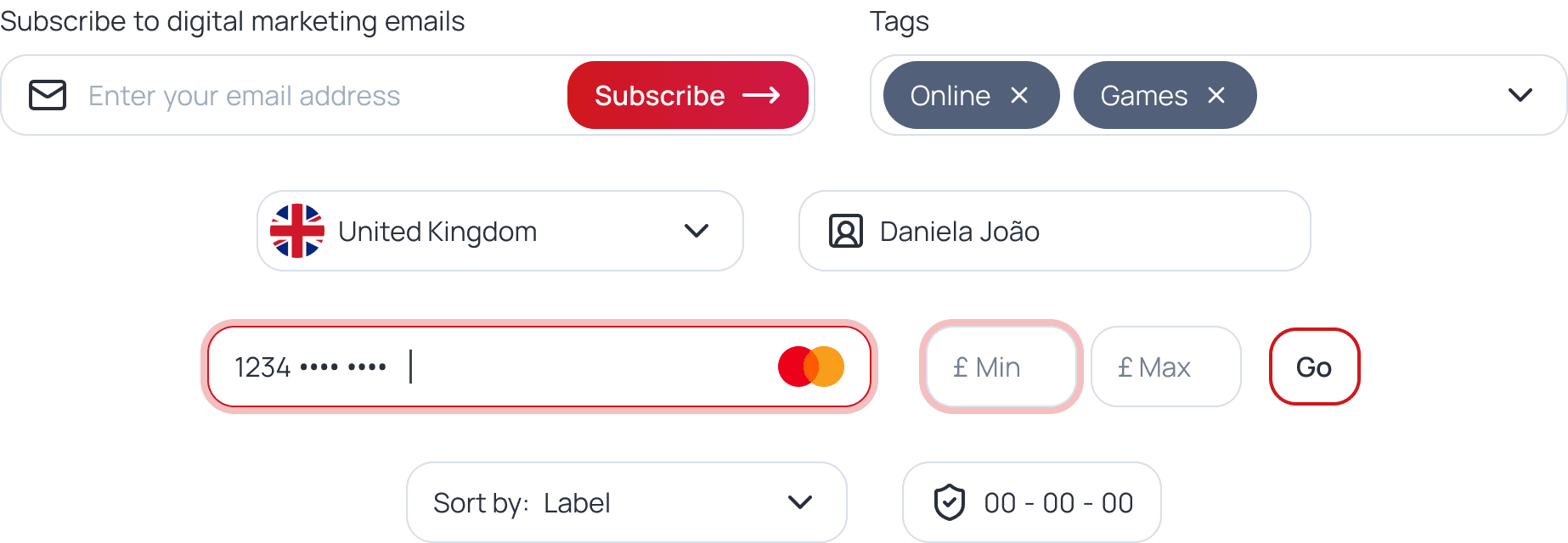 Checkboxes enable multi-select, radio buttons enforce single choice, and switches represent immediate on/off states. Tags act as compact visual labels used to categorise products and reinforce content hierarchy across the interface.
