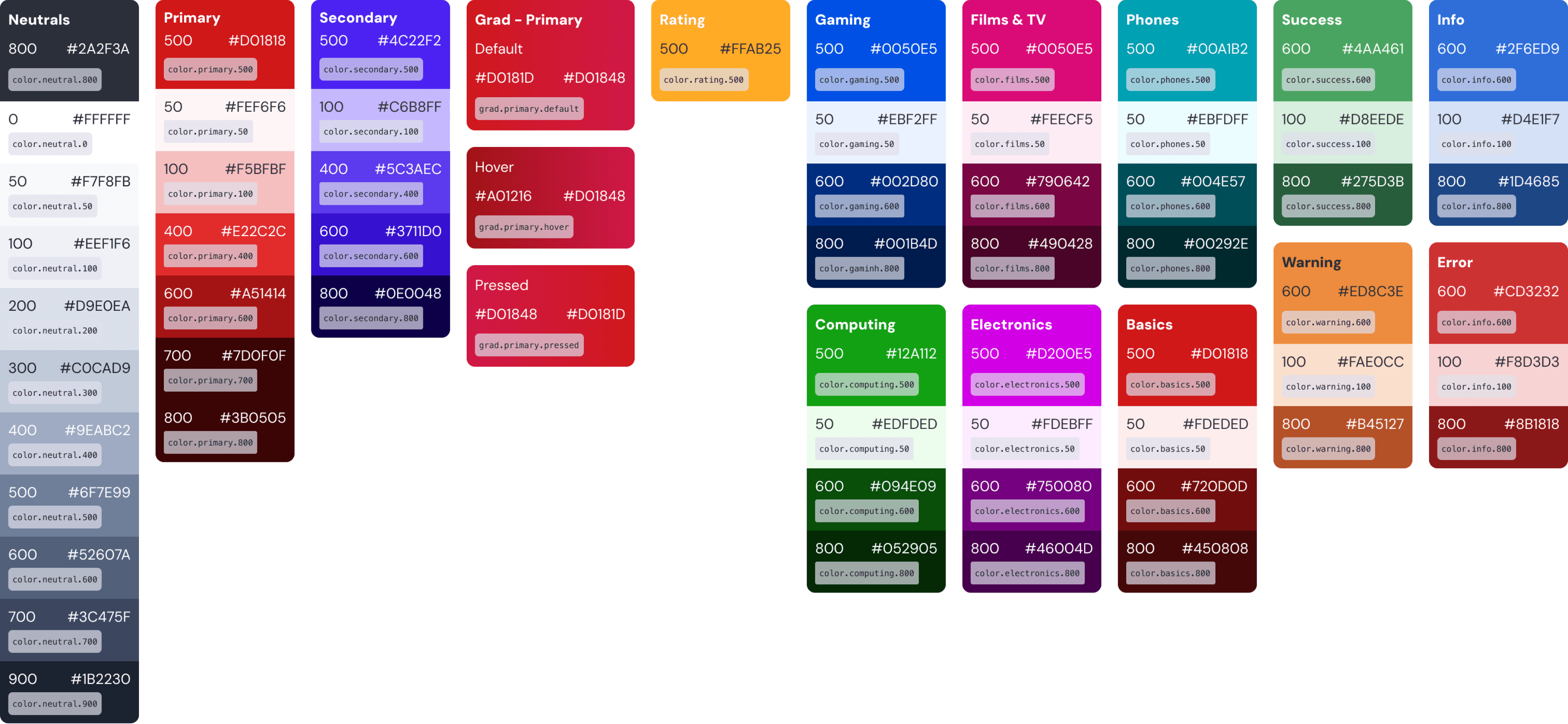 Colour is applied with intent. Primary red anchors brand moments and key actions, category colours guide navigation and wayfinding, and neutrals create breathing room for content-heavy screens.