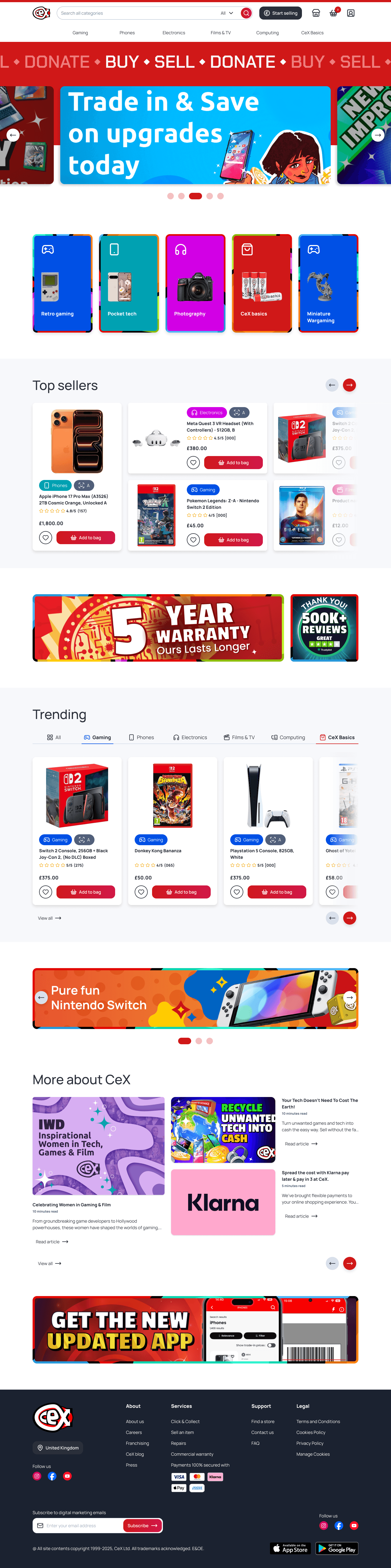 Their use is consistent and purposeful, helping users scan and understand the interface without competing with content. In some areas, icons are also used playfully to add personality and visual rhythm, supporting CeX’s bold, expressive character.