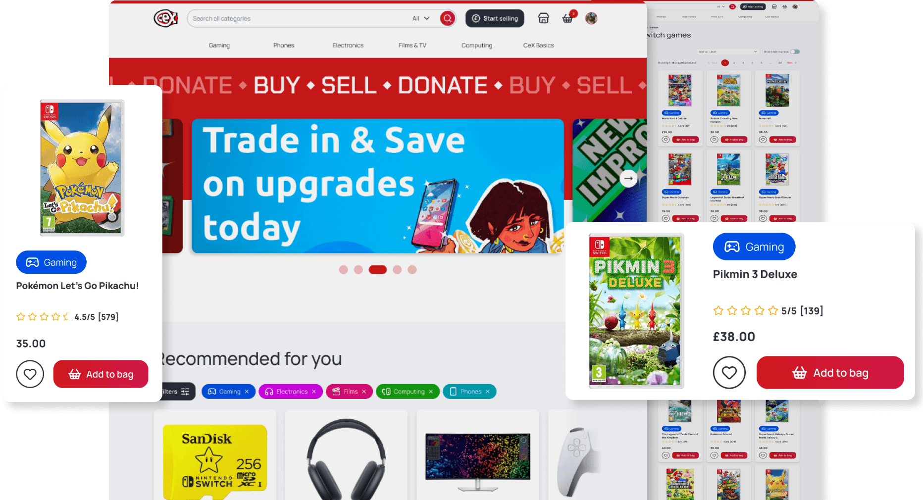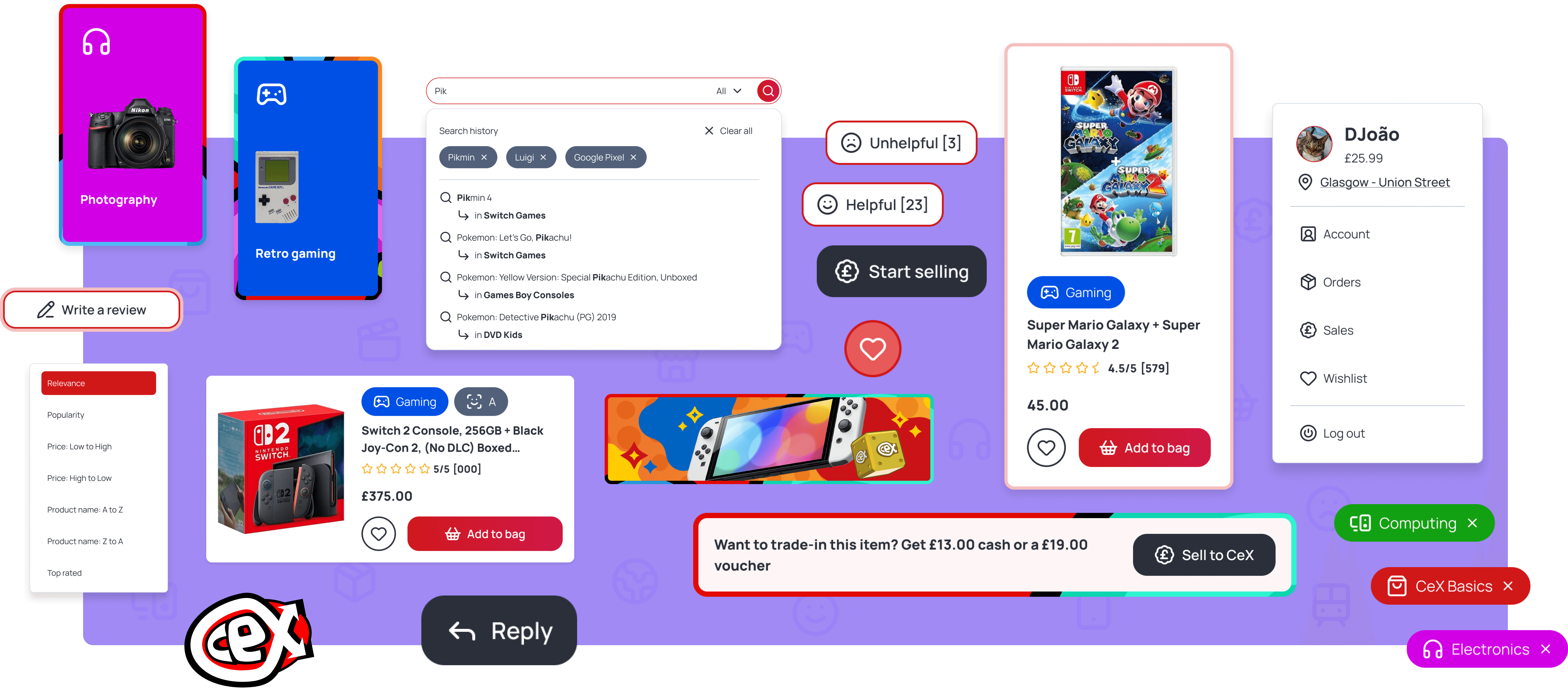 I wanted to bring structure and consistency to a site known for its chaotic charm. While exploring cleaner layouts, tighter grids, and clearer behaviours, I was careful to preserve CeX’s bold, playful energy. The result is a UI system that feels more intentional and usable, while remaining unmistakably CeX, full of colour, character, and pop-culture flair.